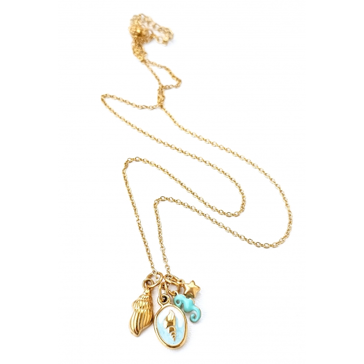 Colar elegante com pérolas barrocas sintéticas e pingentes marinhos que evocam a beleza do oceano. Materiais: pérolas sintéticas barrocas, aço inox dourado, resina. Medidas: aprox. 45 cm + extensor 5 cm.