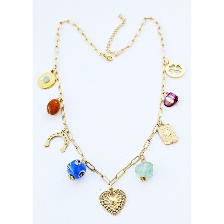 Colar com pendentes simbólicos (mão, ferradura, figas e olho). Proteção e sorte num só acessório. Material: Aço inoxidável prateado e resina. Medida: 50 cm aprox.