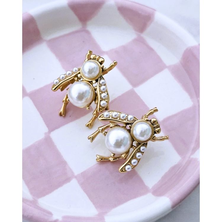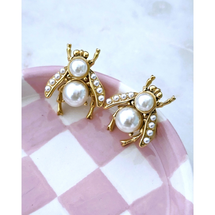 Brincos redondos com abelha dourada em relevo sobre base esmaltada. Delicados e cheios de personalidade. Material: Liga metálica dourada e esmalte Medida: aprox. 2 cm