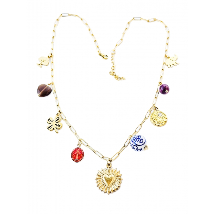 Colar em aço inoxidável com conjunto de amuletos simbólicos: elefante, trevo da sorte, Mão de Fátima com olho protetor e conta em pedra natural jaspe imperial. Uma peça criada para atrair sorte, fortalecer a energia pessoal e envolver quem usa numa vibração de proteção e harmonia. Mede 45cm + 5cm de extensor
