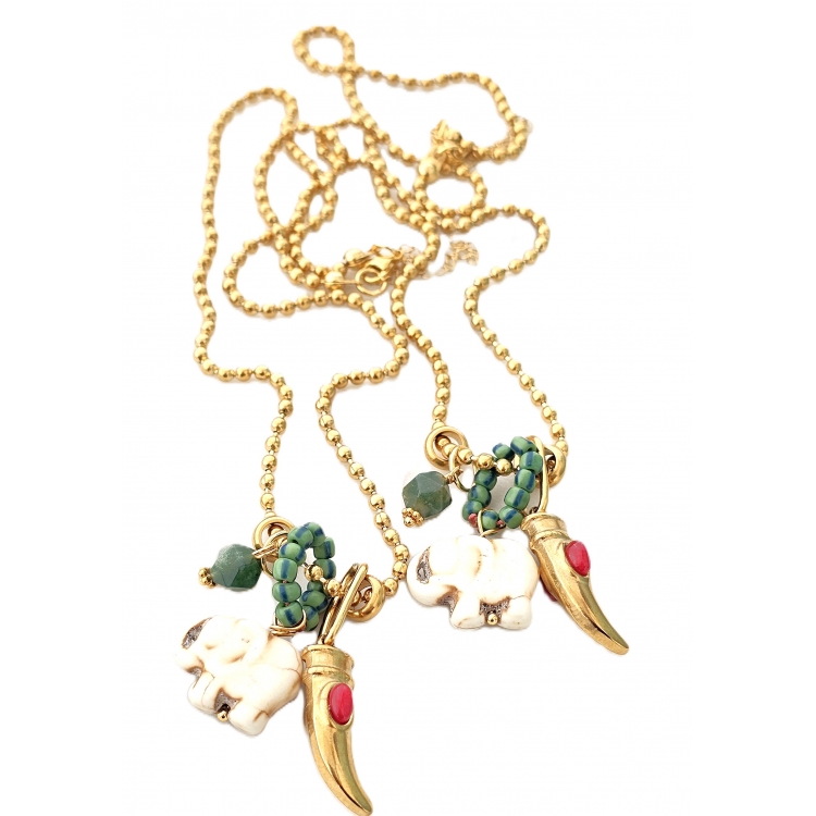 Colar marcante em tons de verde com pingentes divertidos que trazem alegria ao look. Materiais: contas sintéticas, elefante e trevo em cerâmica, cogumelo em vidro de murano, aço inox dourado.Medidas: aprox. 50 cm.