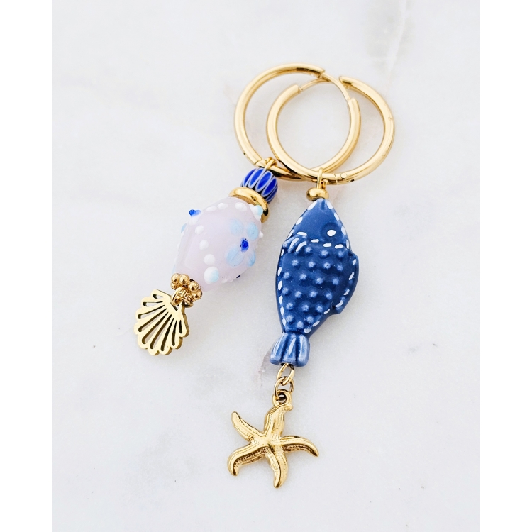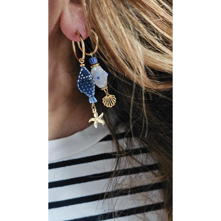 Argolas douradas <assimétricas om contas coloridas e pendentes concha e peixe. Vibração verão total. Material: Aço inoxidável e contas em cerâmica e murano Medida: argola 2,5 cm | comprimento total aprox. 7cm e 6,5 cm