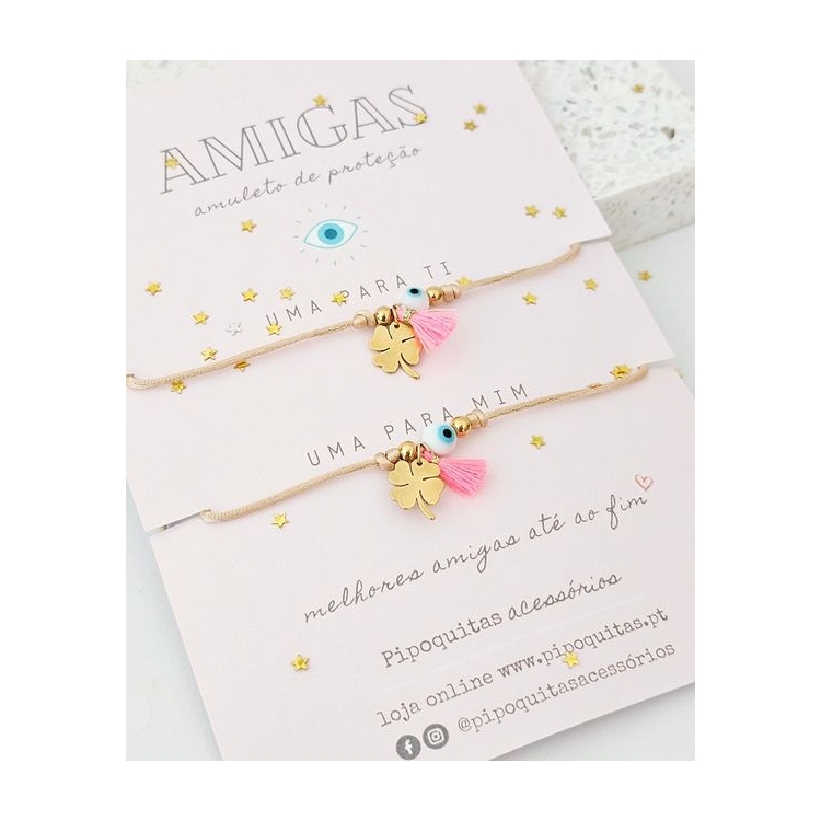 Pack composto por duas pulseiras em cordão de seda, olho da sorte em murano e pompom de algodão. Entremeios em aço inoxidável. Ajustáveis ☆ Feito à mão com amor ☆ Misture e combine com suas peças favoritas ☆ Para garantir que suas peças durem o máximo possível, consulte nossas instruções de cuidados.14,90 €DisponívelPACK PULSEIRAS MÃE E FILHA